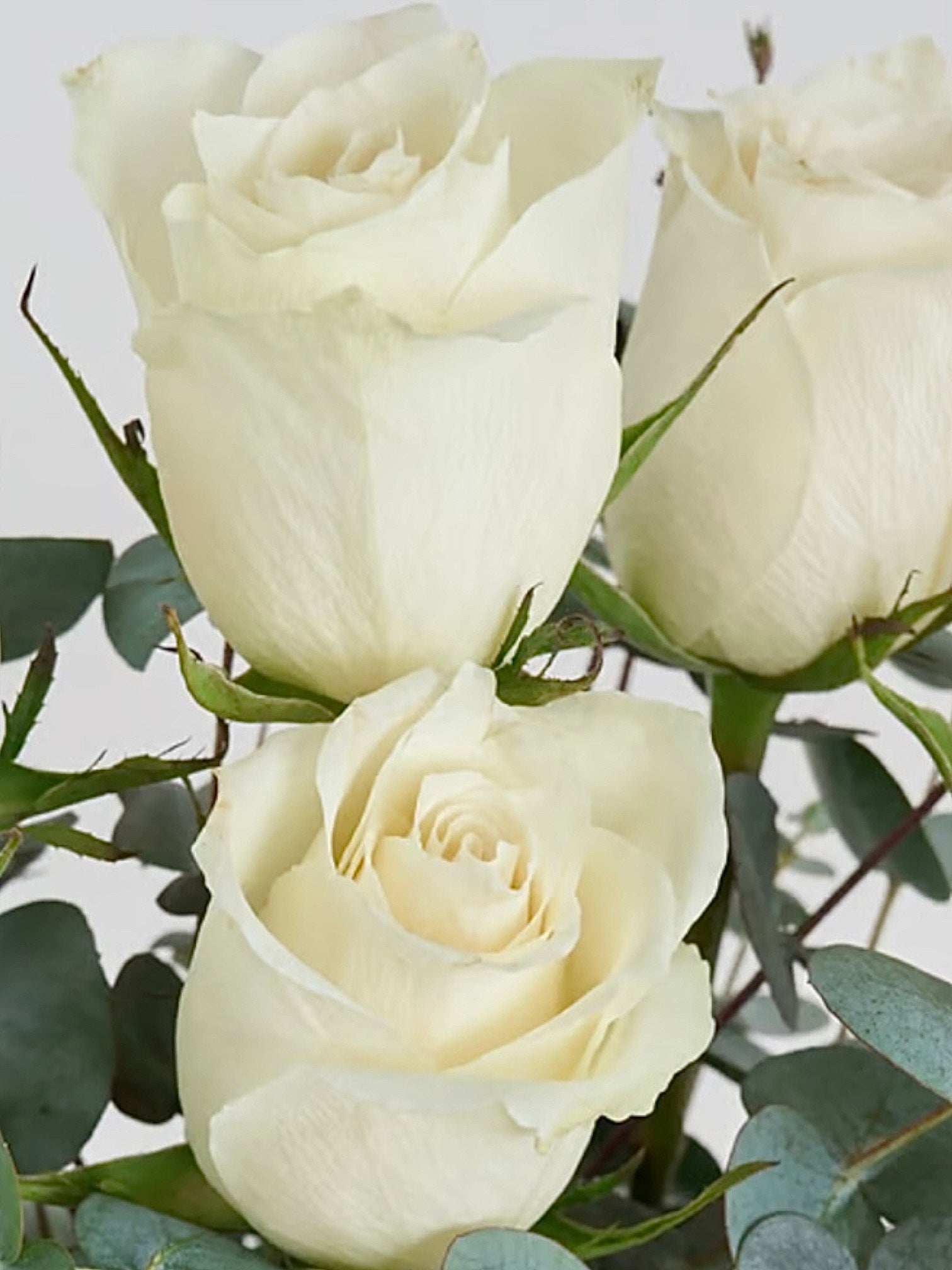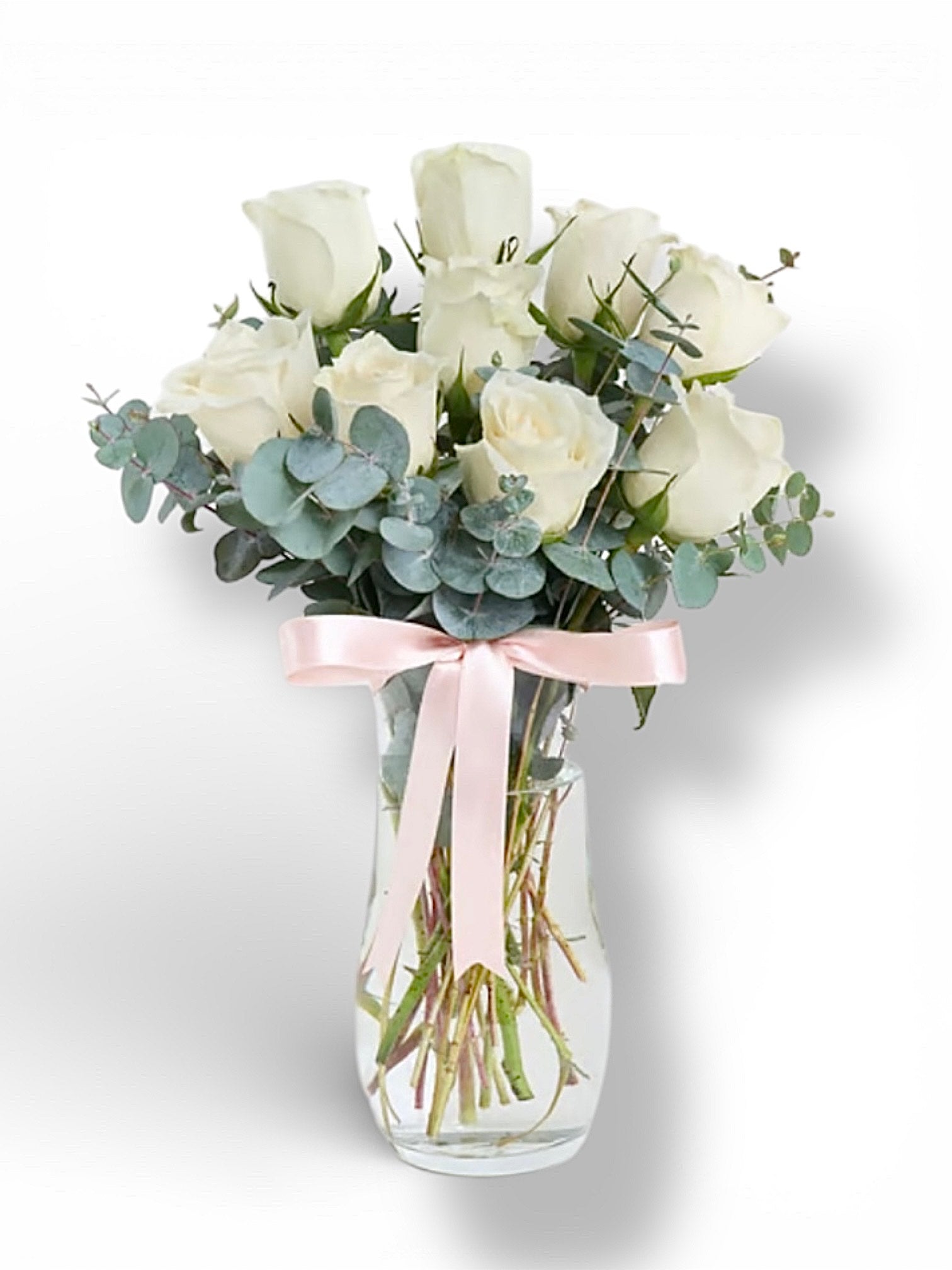 Zarafetin ve sadeliğin simgesi olan beyaz güller, doğal okaliptus yapraklarıyla bir araya gelerek zamansız ve şık bir aranjman oluşturur. Cam vazo içerisinde, pastel pembe kurdele detayıyla tamamlanan bu özel tasarım; modern, ferah ve romantik bir görünüm sunar.