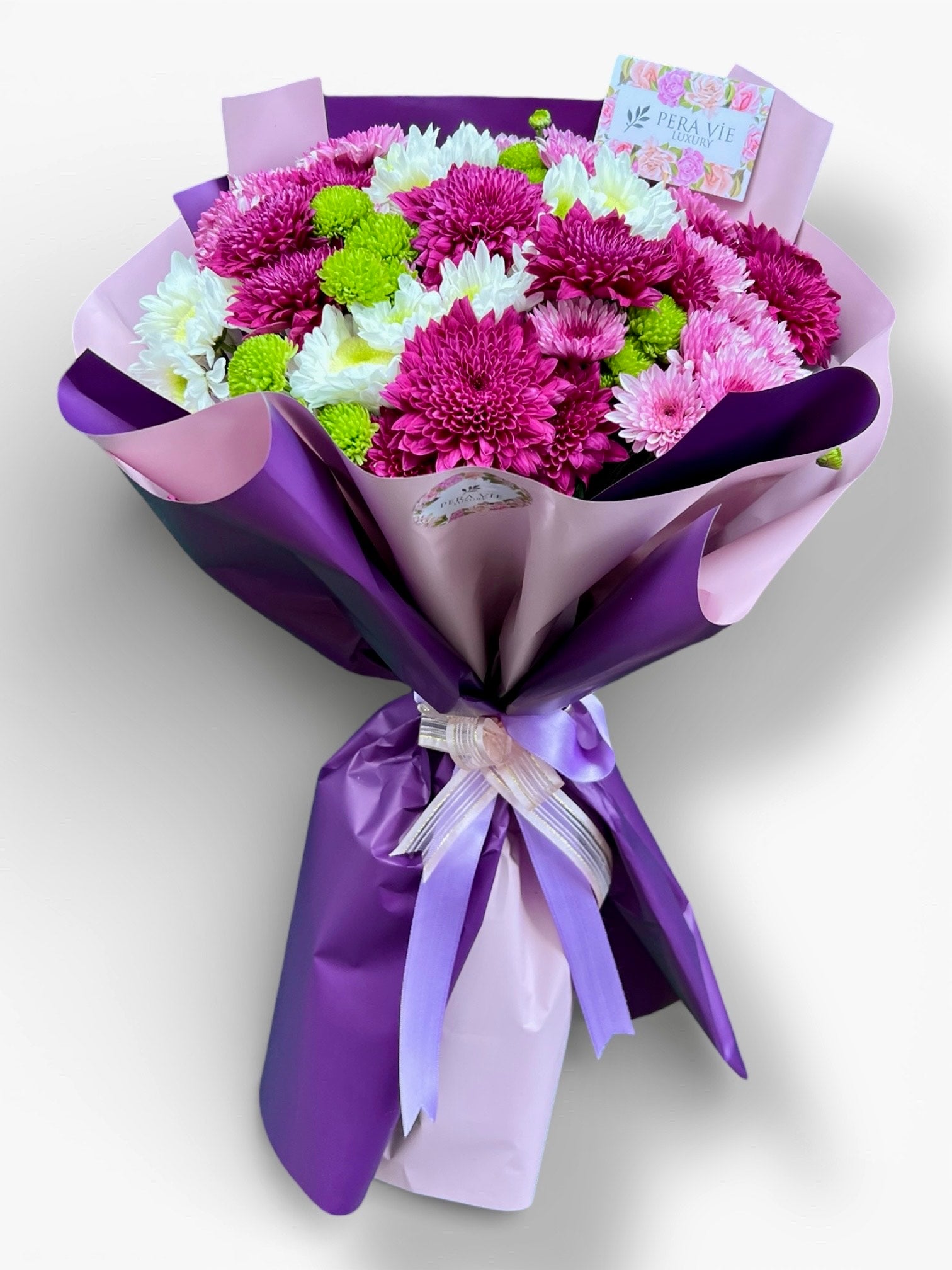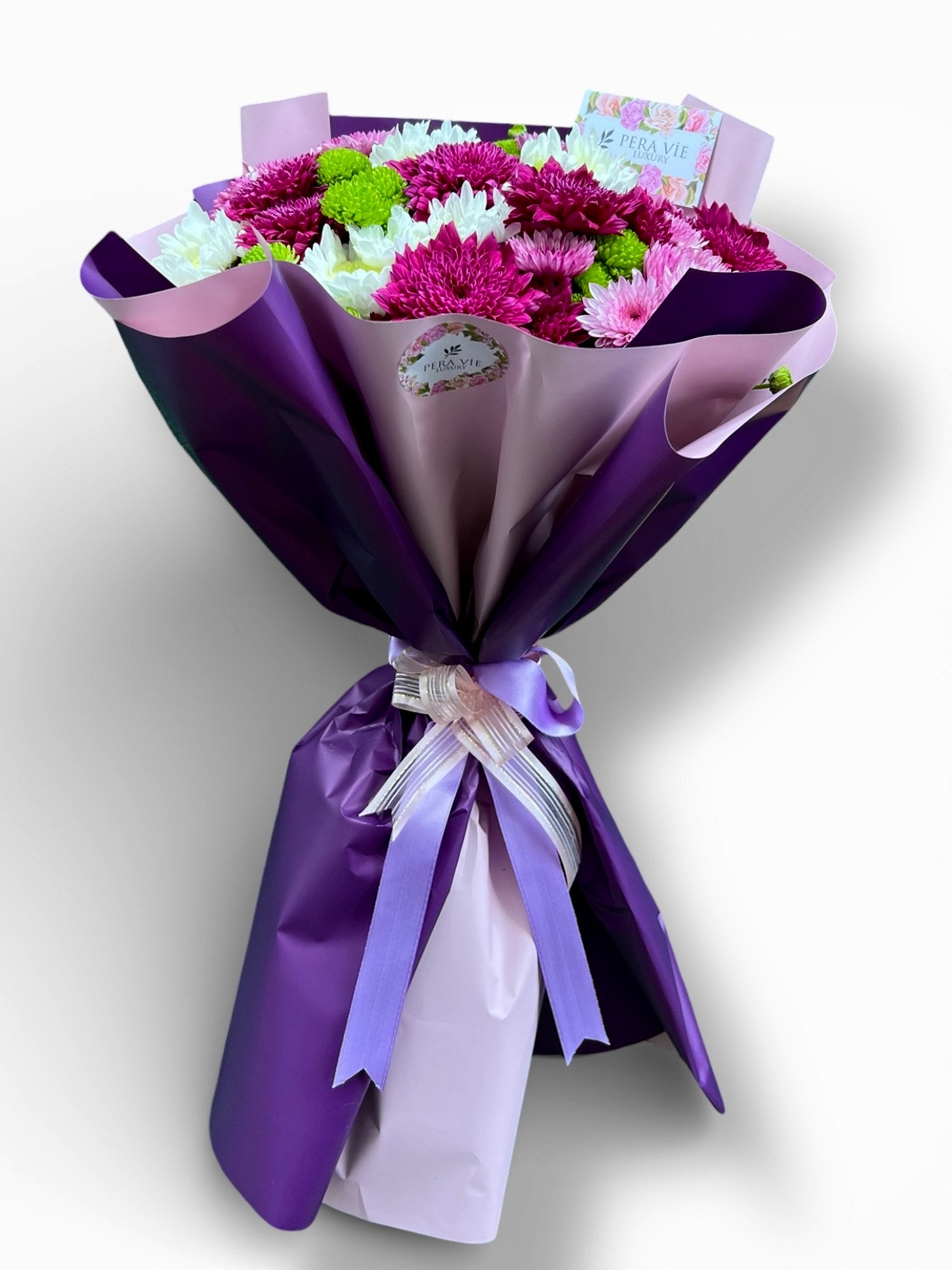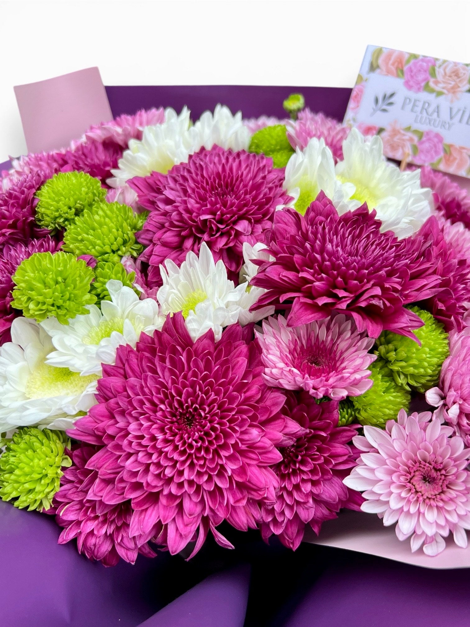 Canlı pembe, mor ve beyaz tonlarındaki krizantemlerin enerjik uyumuyla hazırlanan bu gösterişli buket, ferah yeşil detaylarla dengelenerek göz alıcı bir tasarım sunar. Mor ve lila tonlarındaki modern ambalajı ve zarif kurdele bağlamasıyla; hem neşeli hem de sofistike bir hediye alternatifi olarak öne çıkar.