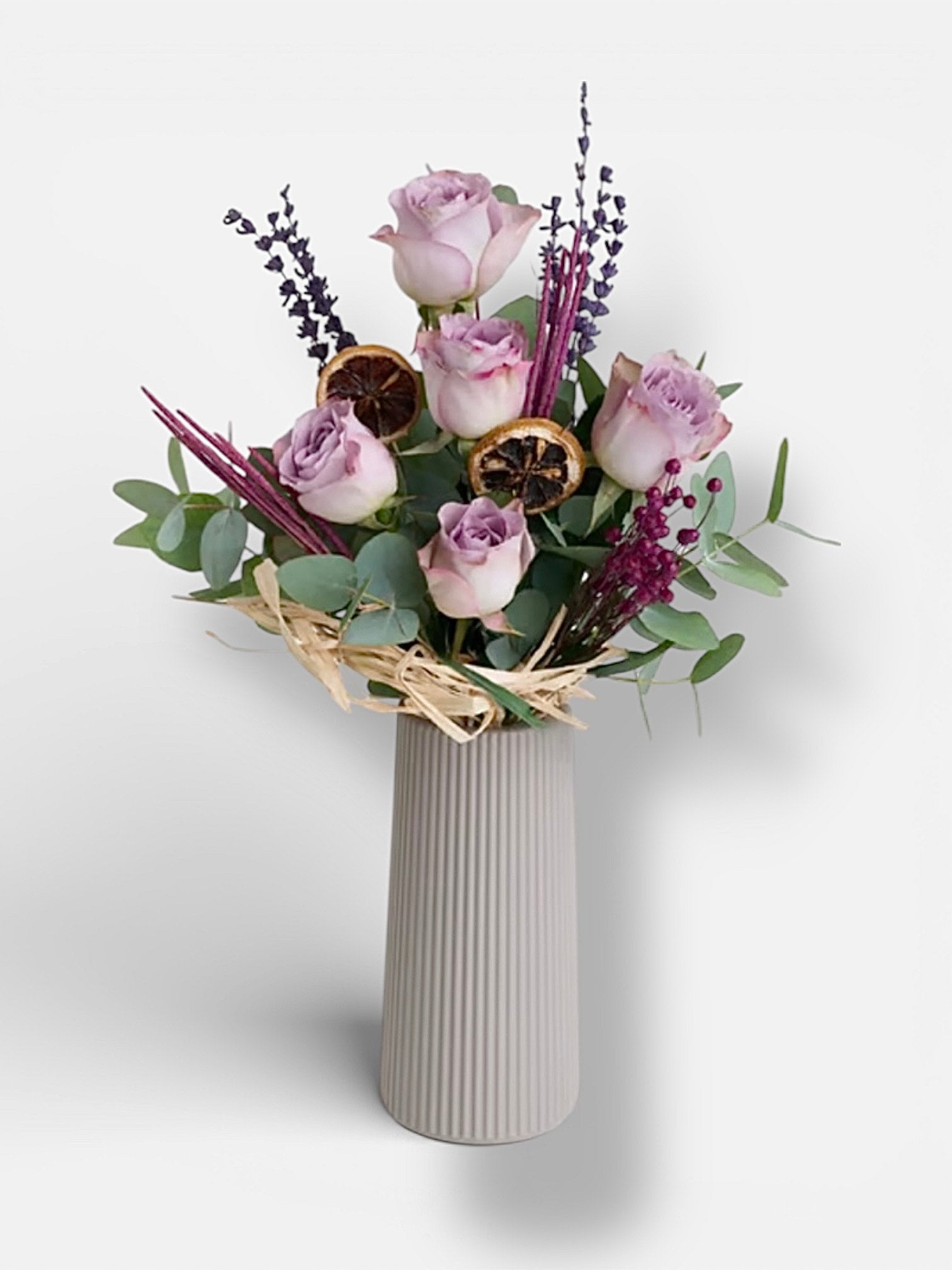 Lila tonlarındaki güllerin zarafeti, doğal okaliptus yaprakları ve dekoratif kuru portakal detaylarıyla buluşarak özgün ve modern bir aranjman oluşturur. Özel tasarım seramik vazo içerisinde sunulan bu butik çalışma; doğal, sofistike ve sıcak bir atmosfer yaratır.