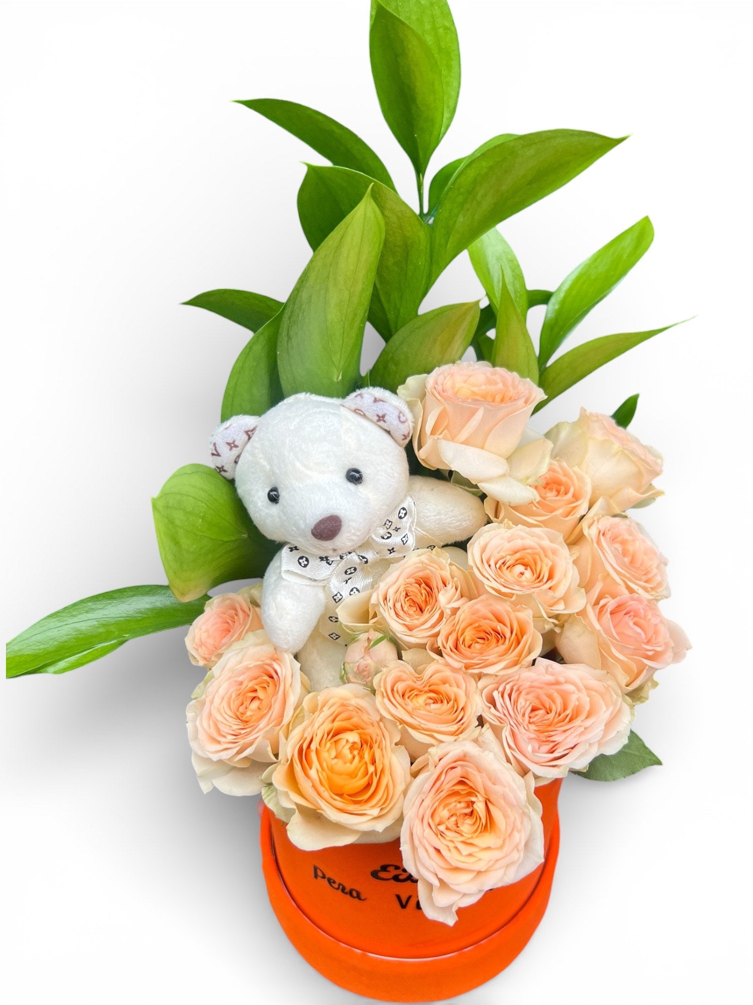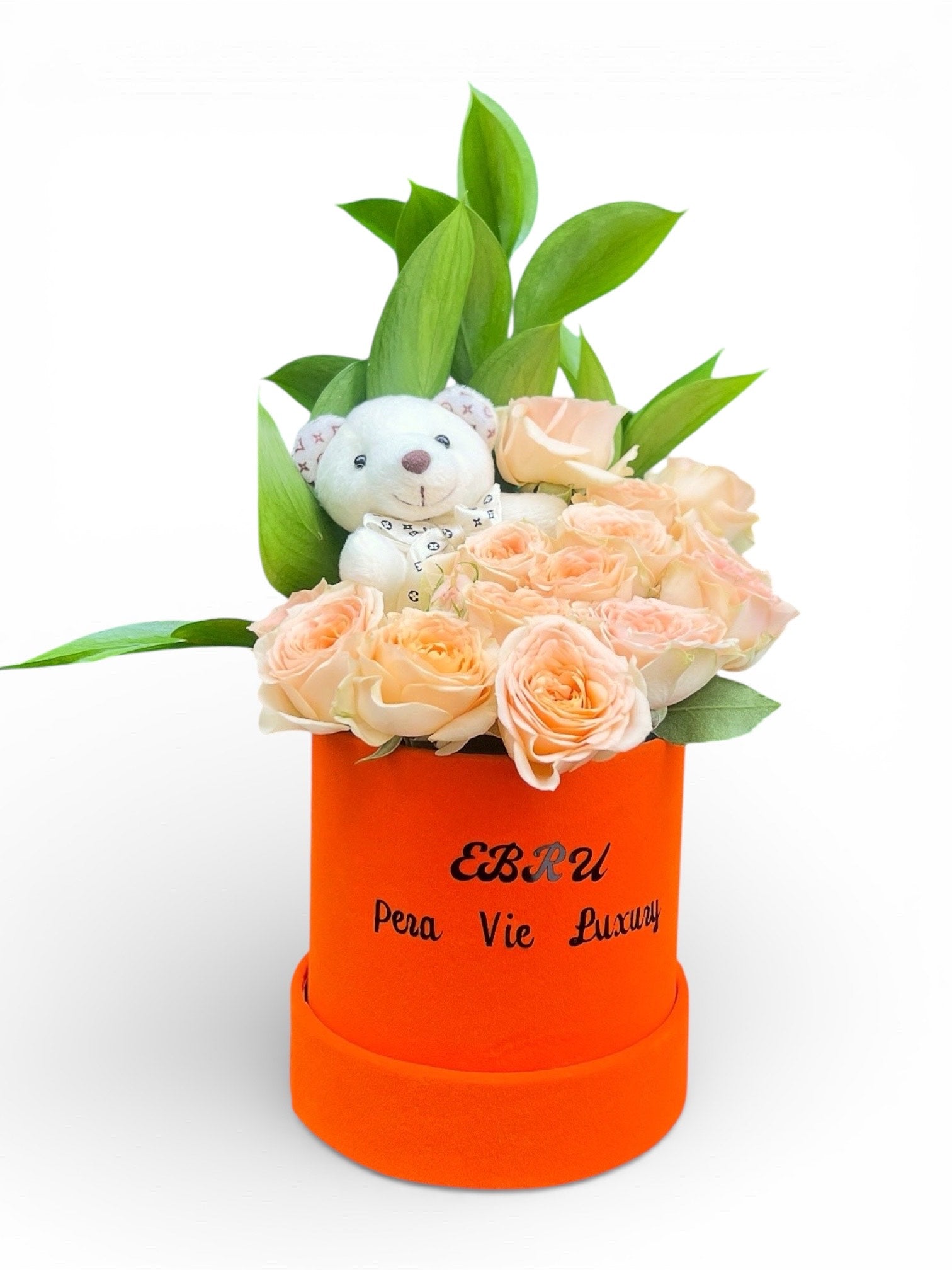 Yumuşak somon tonlarındaki zarif güller ve sevimli peluş ayıcığın uyumuyla hazırlanan bu özel kutu aranjmanı, sıcak ve içten duyguları en şık haliyle yansıtır. Canlı yeşil yapraklarla tamamlanan tasarım, turuncu silindir kutu içerisinde modern ve enerjik bir görünüm sunar. Sevdiklerinize tebessüm ettirecek, duygusu yüksek ve unutulmaz bir hediye alternatifi.
