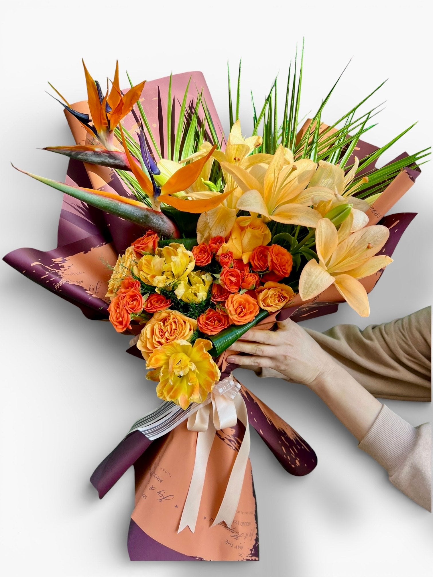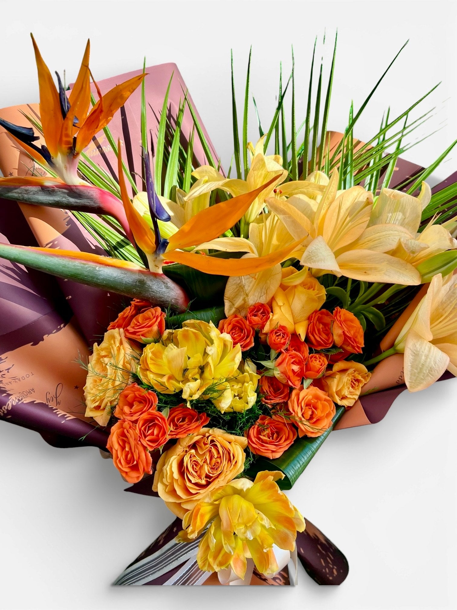 Koyu turuncu güller, sarı lilyumlar ve egzotik strelitzia (cennet kuşu) çiçeklerinin göz alıcı uyumuyla hazırlanan bu özel buket; enerjiyi, gücü ve zarafeti bir arada sunar. Tropikal yeşil yapraklar ve sıcak tonlardaki modern ambalajı sayesinde son derece çarpıcı ve lüks bir görünüm kazanır. Özel günlerde unutulmaz bir etki bırakmak isteyenler için tasarlanmıştır.